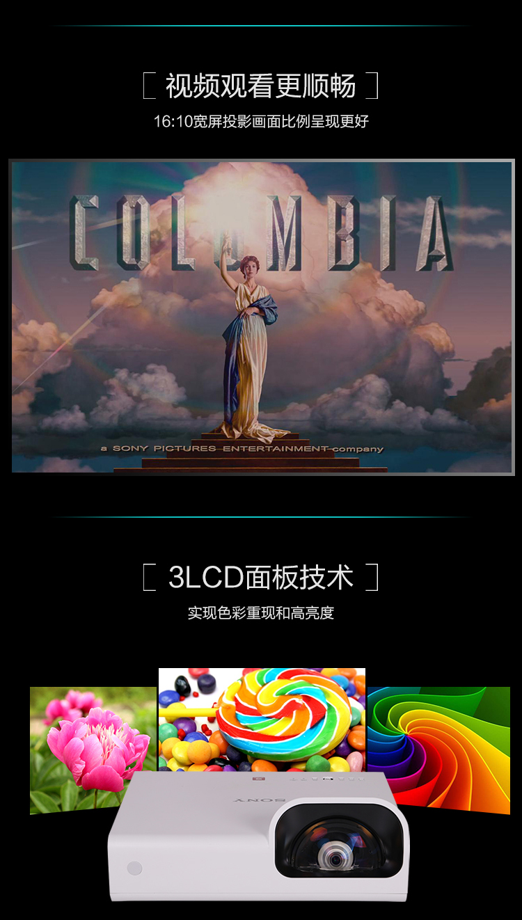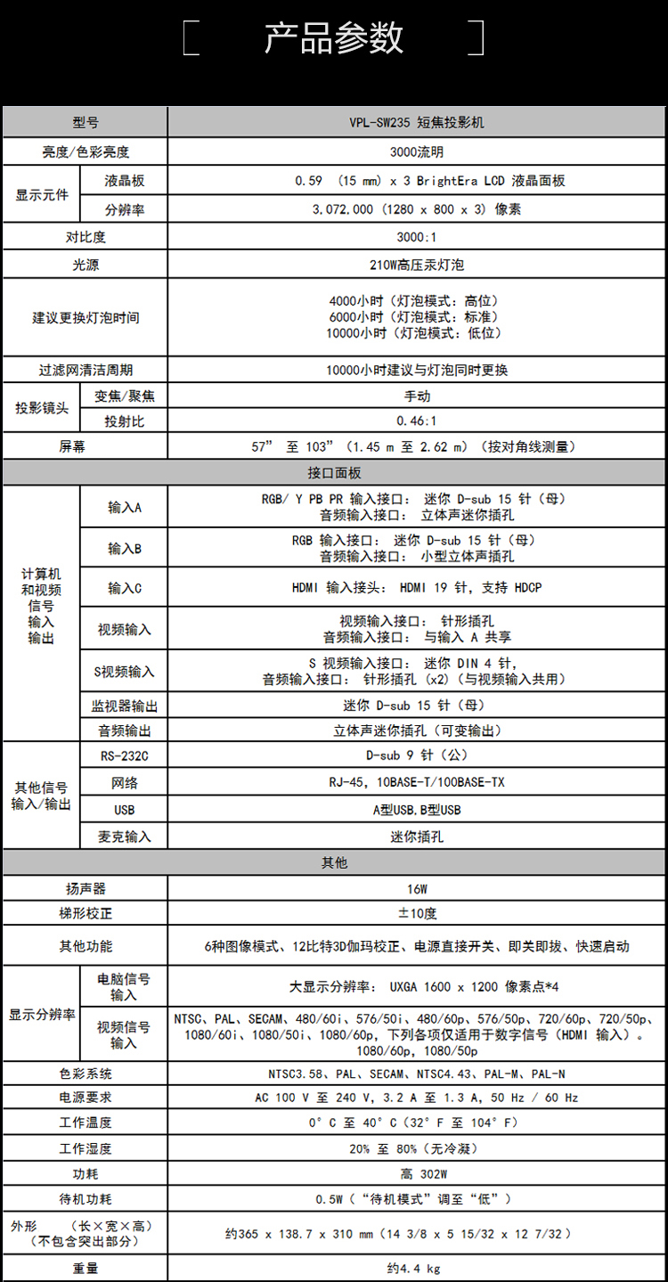 索尼(SONY) VPL-SW235 短焦 投影儀 投影機 短焦寬屏機型 0.75米投射80英寸